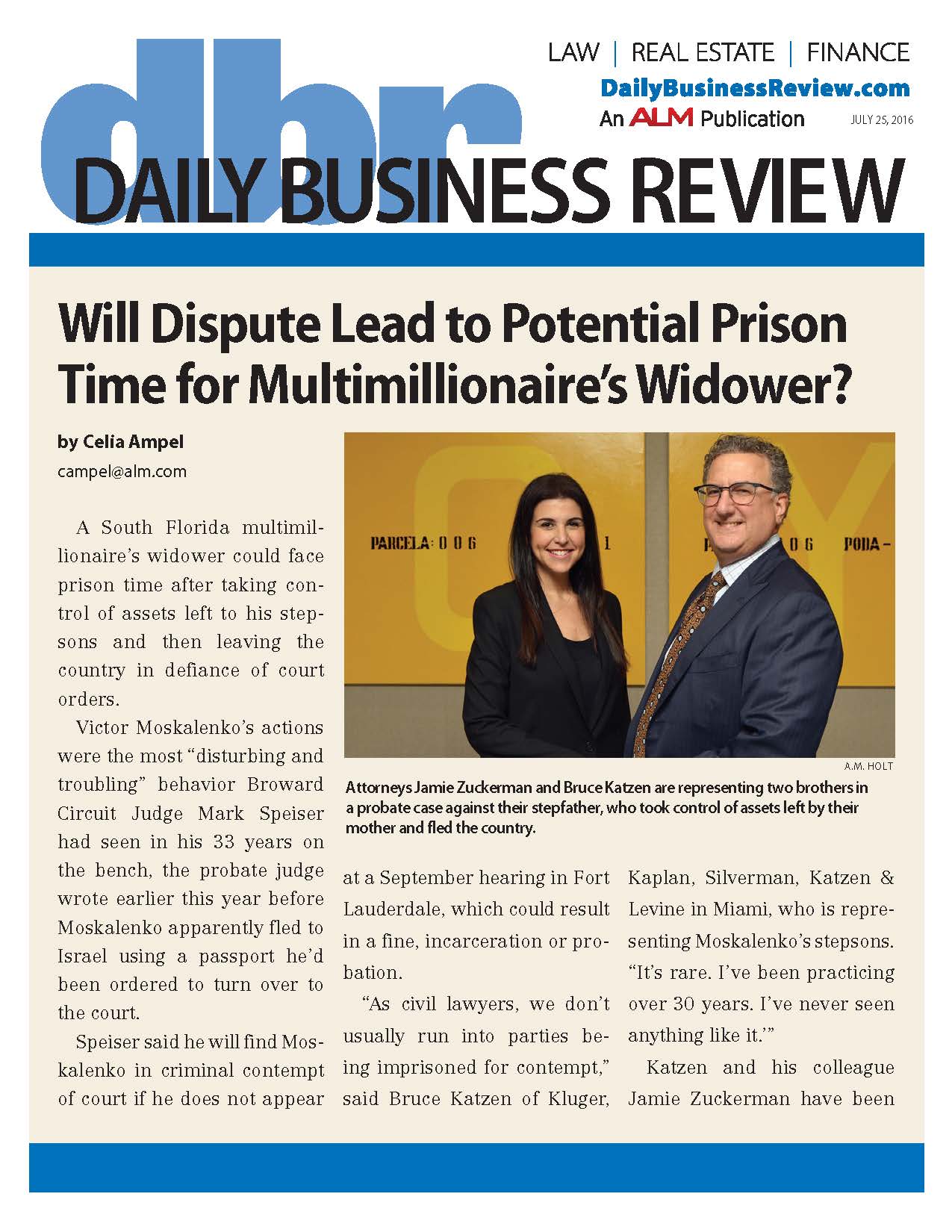 Daily Business Review – Will Dispute Lead to Potential Prison Time for Multimillionaire’s Widower? (July 25, 2016)