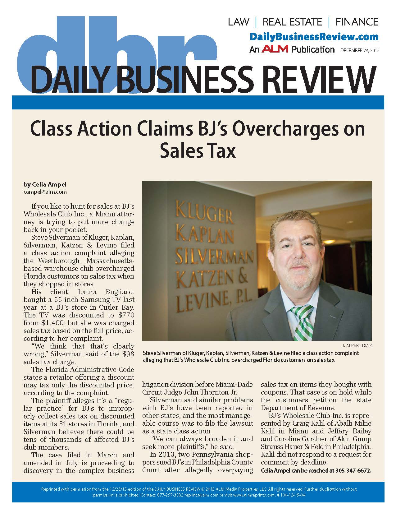 Daily Business Review – Class Action Claims BJ’s Overcharges on Sales Tax (December 23, 2015)