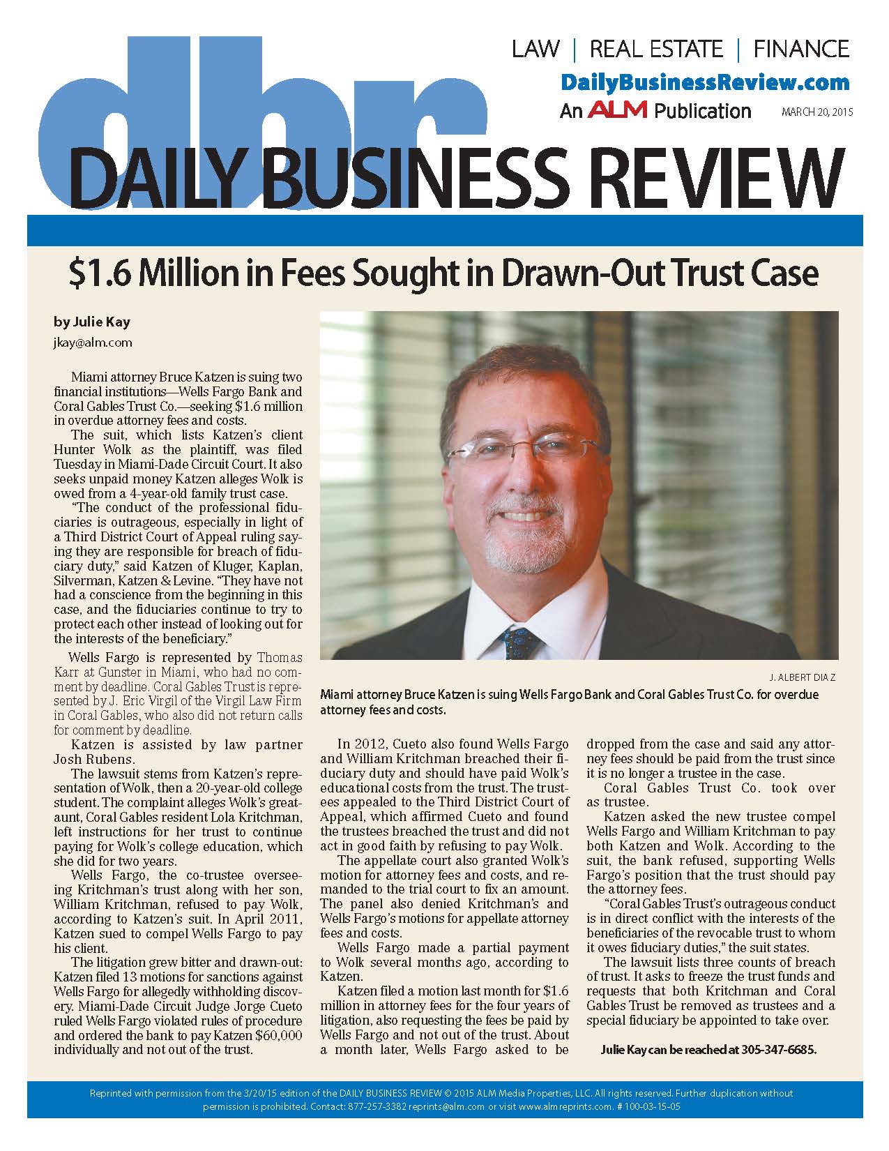 Download this article – PDF $1.6 Million in Fees Sought in Drawn-Out Trust Case by Julie Kay jkay@alm.com Miami attorney Bruce Katzen is suing two financial institutions—Wells Fargo Bank and Coral Gables Trust Co.—seeking $1.6 million in overdue attorney fees and costs. The suit, which lists Katzen’s client Hunter Wolk …