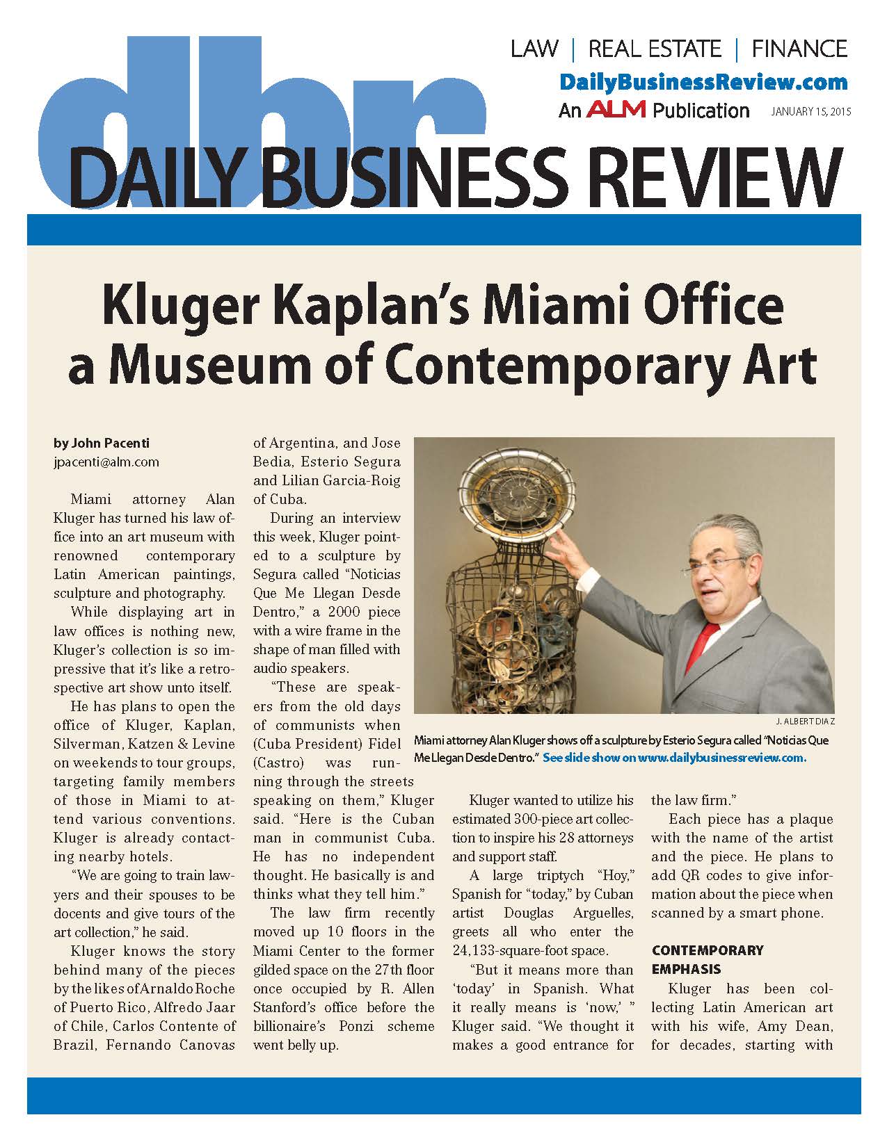 Daily Business Review – Kluger Kaplan’s Miami Office a Museum of Contemporary Art (January 15, 2015)