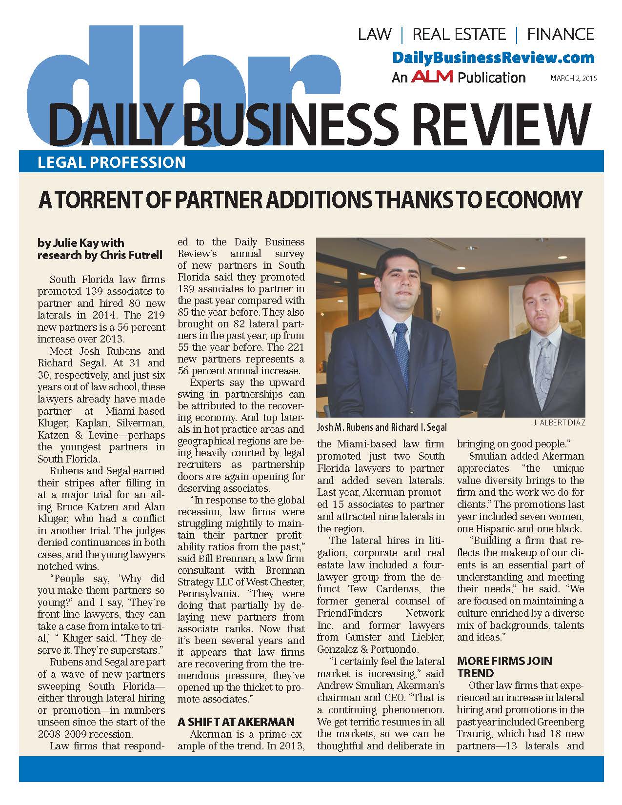 Download this article – PDF A Torrent of Partner Additions Thanks to Economy Julie Kay with research by Chris Futrell, Daily Business Review March 2, 2015 South Florida law firms promoted 139 associates to partner and hired 80 new laterals in 2014. The 219 new partners is a 56 …